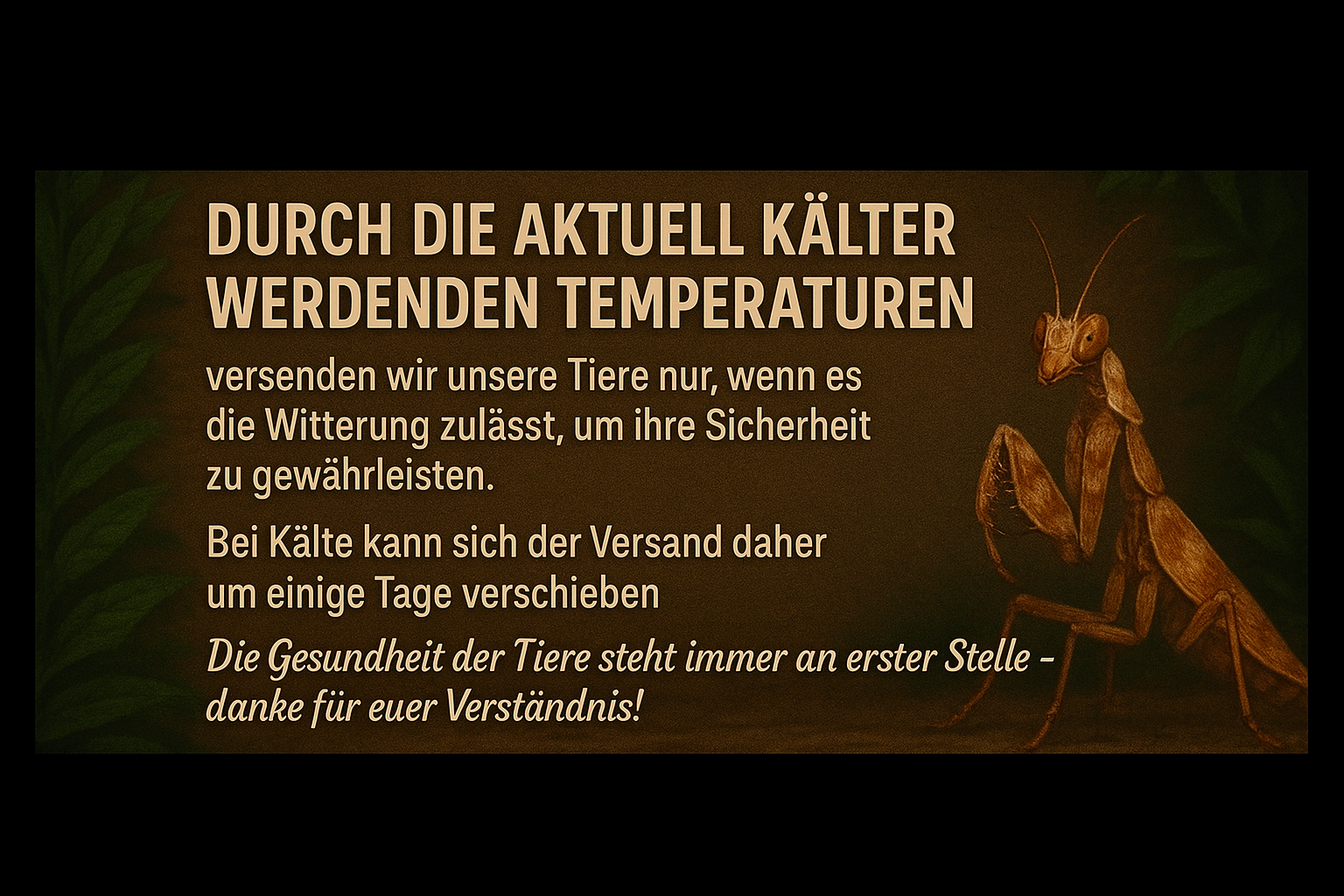 Bei Mantiden Park findest du gesunde Gottesanbeterinnen aus eigener Nachzucht, frische Futtertiere & Zubehör und ehrliche Beratung – damit Haltung und Zucht sicher gelingen.